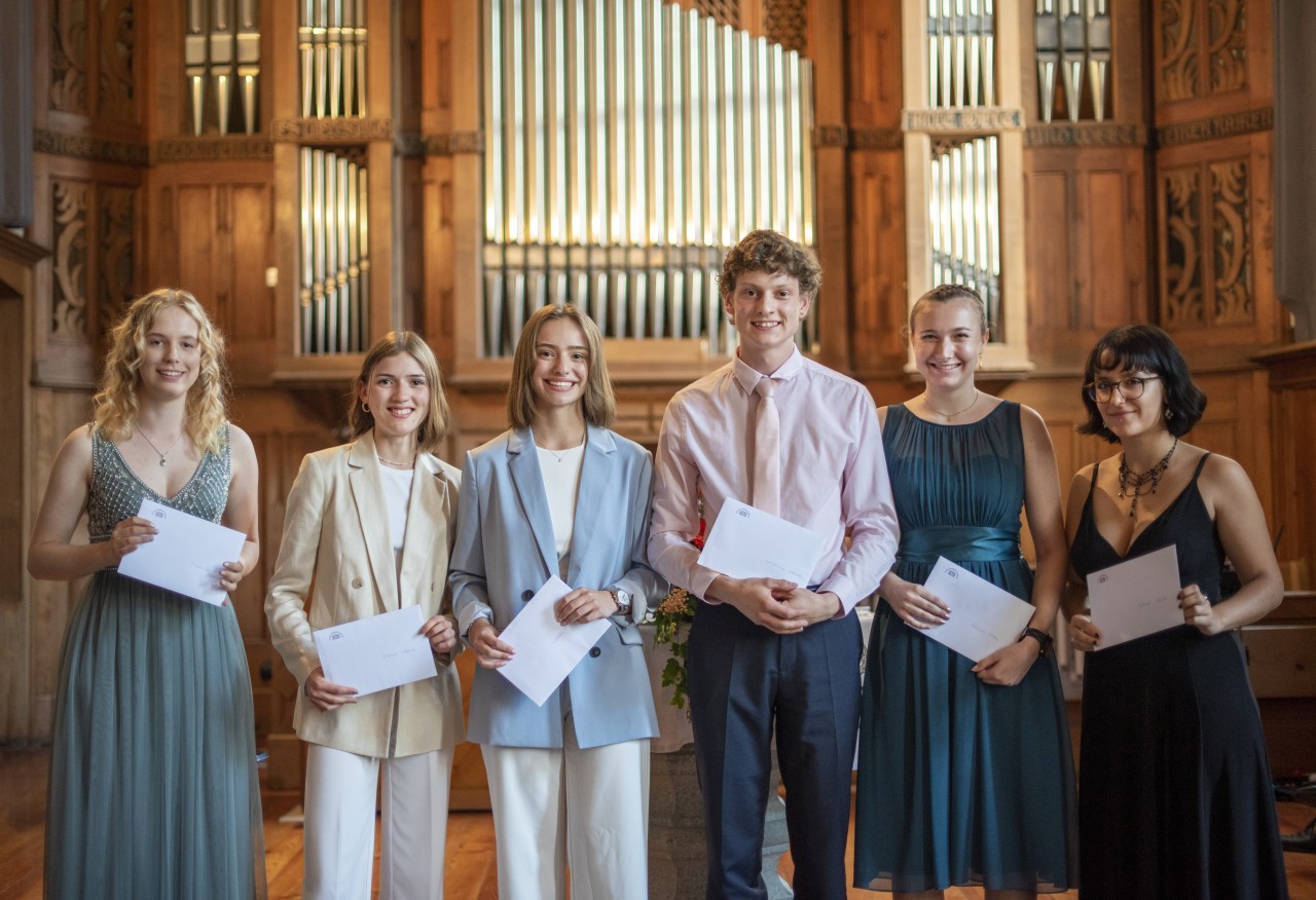 Für die besten Abschlüsse ausgezeichnet wurden: Fadrina Conrad (bester Fachmittelschulausweis), Dina Merk (beste Matura insgesamt), Mara Andrea Meier (beste Matura Wirtschaft&Recht), Mischa Weiss (beste Matura Musisch), Paula Frey (beste Matura Mathe/Naturwissenschaften), Sina Joos (beste Matura Sprachen).